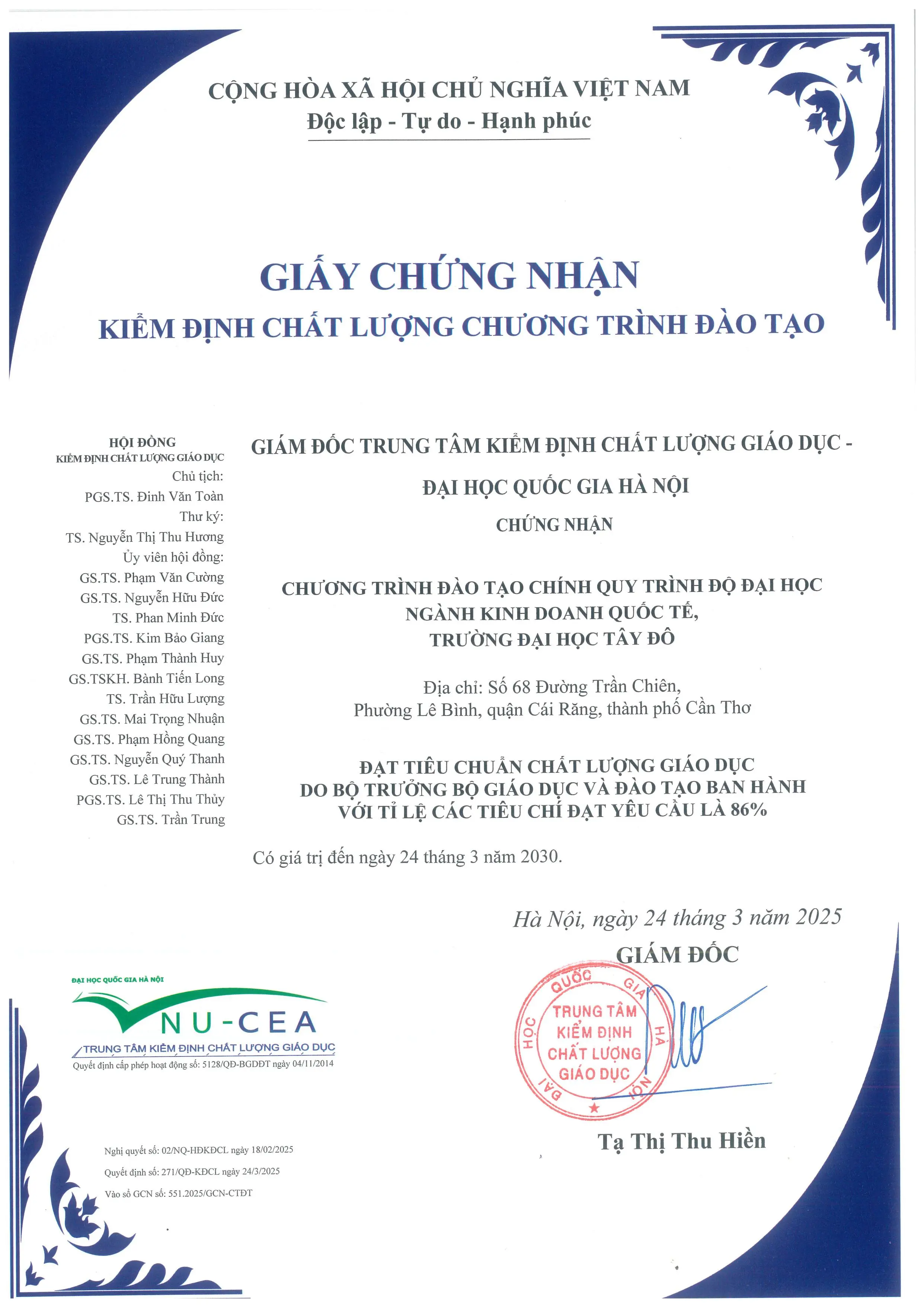 The Business Administration program at Tay Do University trains bachelors with multidisciplinary knowledge, management skills, business operations, and ethical qualities, ready to assume positions such as CEO, business expert, marketing, human resources, or entrepreneurship. With a modern learning environment, students are equipped to meet the high demand for human resources in the integrated economy, opening up diverse job opportunities at corporations, companies, or teaching.
